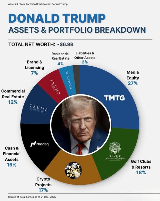 Donald Trump, der aktuelle Präsident der USA, ist nicht nur eine politische Figur, sondern auch ein Milliardär mit einem diversifizierten Vermögensportfolio. Ein kürzlich veröffentlichtes Diagramm von Forbes (Stand: 21. Dezember 2025) gibt einen spannenden Einblick in die Struktur seines Nettowerts, der auf etwa 6,9 Milliarden US-Dollar geschätzt wird – obwohl das Diagramm irrtümlich ein Minuszeichen zeigt, was wahrscheinlich ein Darstellungsfehler ist. Basierend auf aktuellen Forbes-Daten liegt Trumps Nettowert am 26. Dezember 2025 bei rund 6,6 Milliarden Dollar, was Schwankungen durch Aktienkurse und andere Faktoren widerspiegelt. In diesem Beitrag werfen wir einen genaueren Blick auf die Aufschlüsselung und was sie über Trumps Finanzimperium verrät.