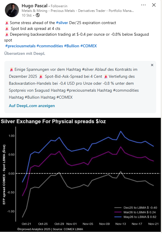 Das, was Hugo Pascal aktuell auf LinkedIn teilt, ist ein bemerkenswertes Zeichen für den Silbermarkt. Genauer gesagt: Der Exchange-for-Physical-Spread (EFP-Spread) beim Dezember 2025-Kontrakt signalisiert eine akute physische Knappheit. Warum das so bedeutend ist und was es konkret für den Silberpreis bedeutet, erkläre ich dir hier Schritt für Schritt.