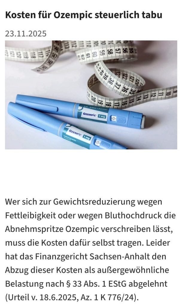 Kurzanalyse: Kosten für Ozempic steuerlich tabu – Urteil des FG Sachsen-Anhalt