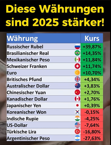 Der Rubel hat 2025 tatsächlich ein beeindruckendes Comeback hingelegt und ist zu einer der weltweit stärksten Währungen geworden – trotz des anhaltenden Ukraine-Kriegs, sinkender Ölexporte und harter westlicher Sanktionen. Die Grafik zeigt eine Aufwertung von rund +40 % gegenüber dem US-Dollar (von ca. 113 RUB/USD Anfang 2025 auf etwa 81 RUB/USD Ende November).